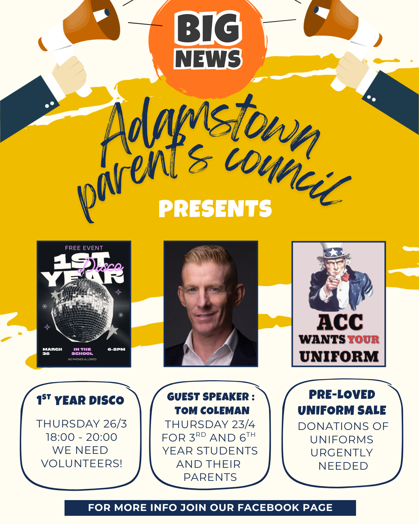 We are currently asking for uniform donations and there is a box left at reception for these. We will also need volunteers to help with the sale on the day. This is always a highlight of the year for the Parent's Council. It directly benefits our parents and students and is always well-attended.