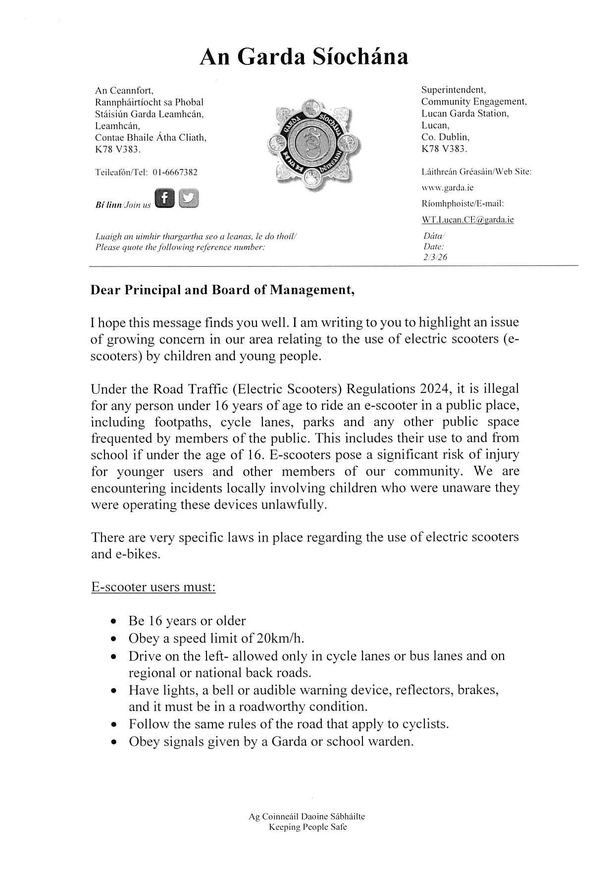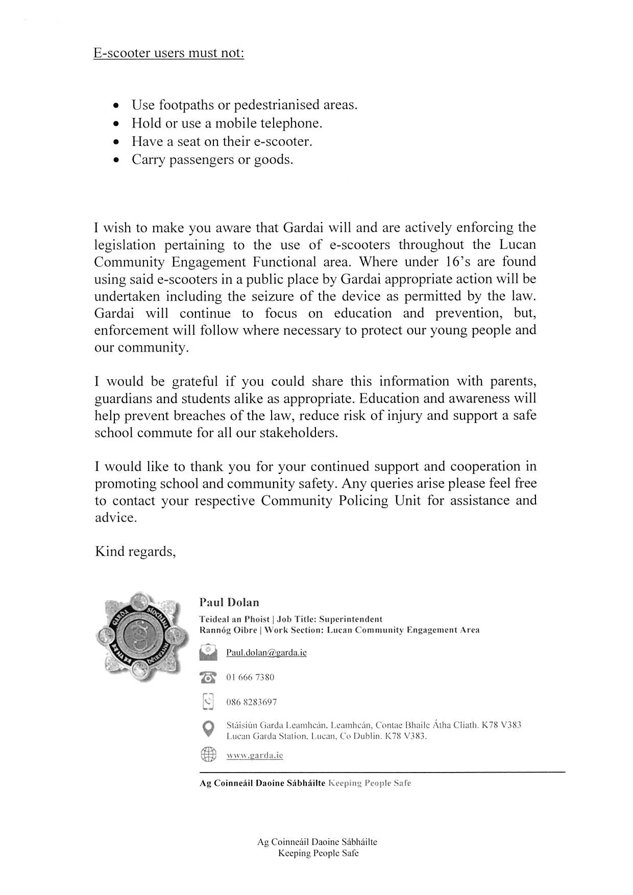 Please see below an important letter received from An Garda Siochana regarding the proper and legal use of E-Scooters.
